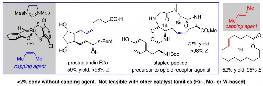 A hallmark of Ru-based olefin metathesis catalysts, which have been pivotal to the emergence of this central transformation, is their ability to promote reactions of hindered alkenes and in the presence of commonly occurring polar functional units such as a neighboring alcohol, an aldehyde, or a carboxylic acid. In 2011, Professor Grubbs and co-workers at California Institute of Technology reported that kinetic control of Z-selectivity can be achieved with Ru catalysts by substituting anionic chlorides with an alkyl and an oxo ligand. In 2013, Professor Amir Hoveyda and co-workers outlined the design of a distinct set of Ru-based complexes that contain a key a bidentate disulfide ligand and may be used for efficient catalytic Z-selective olefin metathesis. The CalTech catalysts have proven to be inefficient in promoting transformations with aryl-substituted or hindered terminal olefins and/or when an aldehyde is present, and their activity is entirely inhibited by a carboxylic acid. The BC catalysts, on the other hand, tolerate such functional groups. Nonetheless, the derived methylidene species decompose too rapidly and reactions involving terminal alkenes, the most accessible substrate class, are low yielding.